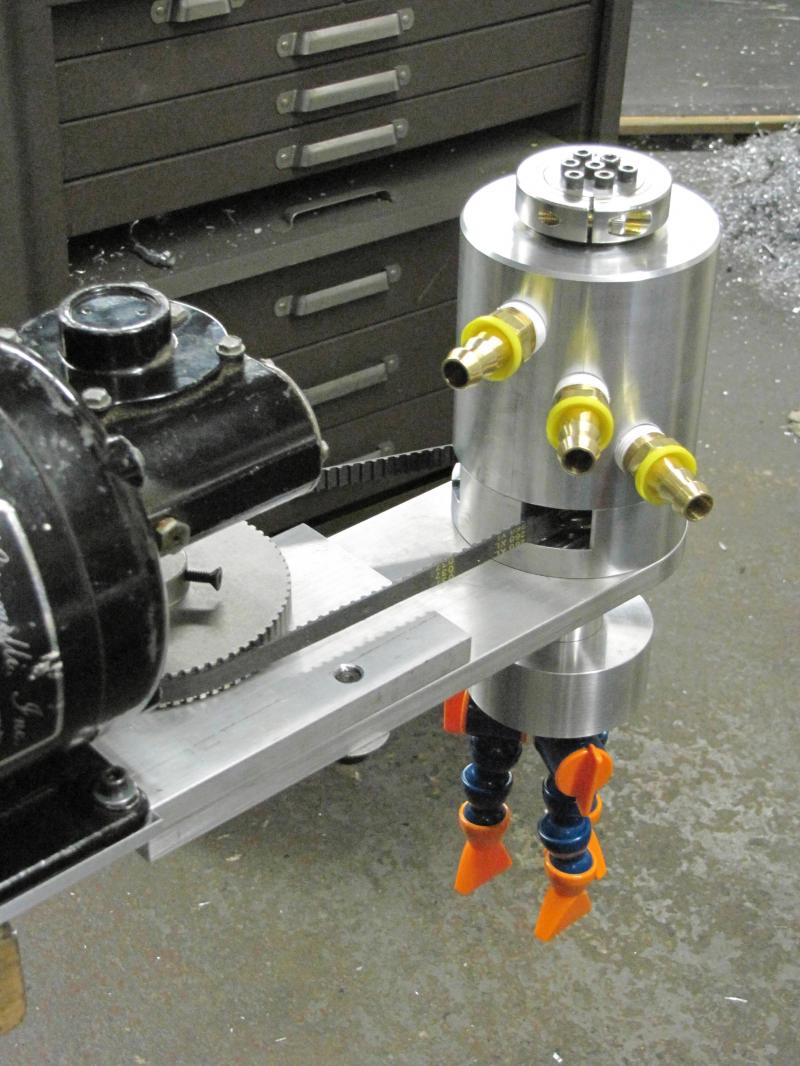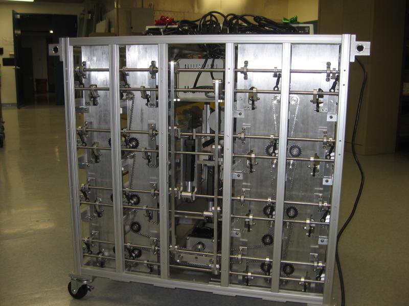 Electro - Mechanical Rig with capability of linear motion drive, 90 volt DC variable speed chain drive and limit switched mechanical lever actuation.