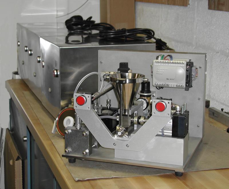 Custom built filling machines waiting to be delivered. Programmable Logic controls timed air operated solenoids actuating stainless steel pistons and Teflon packed ball valves.