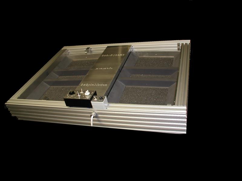 Servo motors buried under the gray surfaces allow this rig to rock or slide in a linear motion.